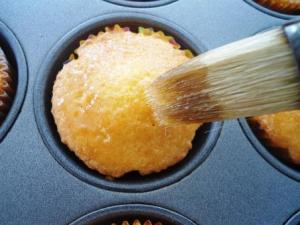Una vez que los retiran del horno, así en caliente deberán pasarles mermelada de naranja. Pueden usar una brocha, pero si no tienen pueden hacerlo con una cucharita, pero con cuidado porque el cupcake es bastante suave. Dejen que los cupcakes se enfríen en el molde por unos 5 a 10 minutos.