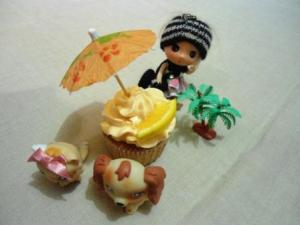 Ya está, colocar el merengue en una manga con la boquilla que más les guste y con ello decorar los cupcakes. Normalmente uso la boquilla 1M, me encanta, pero esta vez decidí innovar y usar la boquilla 2D, que es bastante parecida, la diferencia es que es una estrella un poco más cerrada. Colocar también una rodaja de naranja y para que se vea bien tropical, una sombrilla de papel. El resto de la decoración fue iniciativa de mi Adriana.