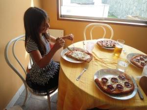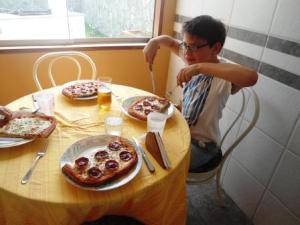 Para el caso de mi esposo y Andrés, pues muy a lo macho ambos quisieron de pepperoni. La verdad es que a mí me encanta la pizza con pepperoni, pero secretamente les cuento que ando con un poco de sobrepeso. El verano no me cae bien saben, los fines de semana son un peligro, eso de estar en la playa y tomar un traguito, un piqueo y después comer algo de parrilla es simplemente fatal, y si a eso le sumamos los desayunos, que son con tamal chinchano, huevos revueltos y mucho pan, pues ya se podrán imaginar cómo ando. Así que tuve que aguantarme las ganas y comer algo un poquito menos calórico…ojo, el queso era el bajo en grasas.