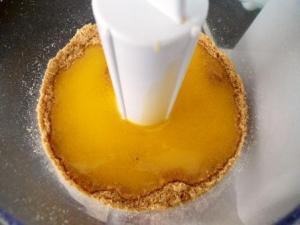 Luego mezclar las galletas con la mantequilla derretida. Esto lo pueden hacer en el mismo procesador (es lo que yo hago) o en un tazón.