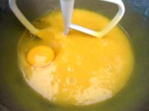 Cuando ya esté fría la mezcla agregar los huevos uno por uno, batiendo bien entre cada adición. Con una espátula raspar los bordes y el fondo del tazón de vez en cuando para lograr una mezcla homogénea.