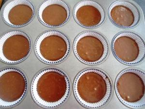 Colocar la masa en los moldes de cupcakes. Los moldes pueden estar con pirotines para horno o en todo caso engrasados y enharinados. Llenar más o menos tres cuartas partes del molde.