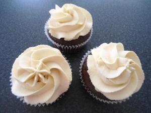 Una vez que los cupcakes estén bien fríos decorar con buttercream perfumada con Bailey’s. Para hacerla, hagan el doble de la receta de Buttercream Clásico, pero en lugar de leche usen Baileys. Colocan la cream en un manga pastelera con la boquilla que más les guste, yo usé la 1M de Wilton. Si desean, pueden agregarle chocolate derretido sobre la crema para darle un toque final. ¿Les gustó?