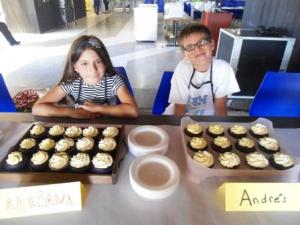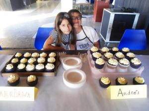 Como deben haber supuesto, Adriana fue quien se dedicó a preparar los cupcakes, yo la ayudé, sobre todo al momento de poner el buttercream, ella aún no domina el uso de la manga repostera. Andrés en cambio ayudó luego en la venta, algo tímido, pero feliz de estar en la oficina de mamá ofreciendo los cupcakes.
