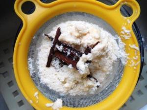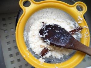 Con la ayuda de una cuchara de madera presionar el coco que queda en el colador, esto con el fin que termine de soltar todo el jugo que queda ahí. Si quieren luego se comen el coco, pero no tiene mucho sabor ya que todo pasó a la leche. Yo termino comiéndome un poco y el resto lo boto.
