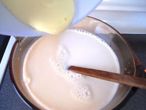 Agregar las yemas a la olla donde están las leches e ir moviendo rápidamente para evitar que las yemas se cocinen de golpe. Sí, en verdad lo que estamos haciendo es una crema inglesa, lo cierto es que me di cuenta cuando puse las yemas, entonce me pregunté ¿por qué pongo las yemas dentro de la leche en este momento y no puse primero una parte de la leche en las yemas y luego regresar todo a la olla para que se cocinen? Pero bueno, yo sólo seguí las instrucciones que me dio mi mami.