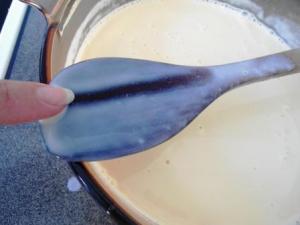 Sin dejar de remover esperar a que cocinen las yemas. Si tienen un termómetro éste debe llegar a unos 85°C/185°F, si no lo tienen pues vayan viendo cómo espesa la crema. Verán que en un principio (luego de agregar las yemas) hay como una capa de espuma, conforme va pasando el tiempo esta capa va desapareciendo, cuando ya no esté es un síntoma de que la crema está lista. Esto lo pueden comprobar con la espátula: levantan la espátula tratando de que tenga algo de crema (es escurridiza), con rapidez pasan el dedo tratando de formar un surco en la crema, si se mantiene el surco ya está, si se vuelve a juntar la crema quiere decir que le falta un poco. Eso sí, por ningún motivo permitan que esta preparación hierva, eso puede hacer que se corte.