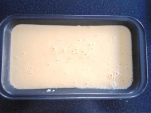 Cuando ya está, inmediatamente retirar del calor. Ahora hay que enfriar la preparación, si la dejan que se enfríe así no más le saldrá una nata en la superficie, así que hay estar moviendo. Les sugiero que tengan un tazón con agua helada con hielo, colocan ahí la olla y mueven hasta que entibie, eso ayudará a que se enfríe más rápido. Luego vaciar la preparación a un molde rectangular y llevar a congelar de un día para otro.