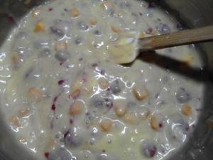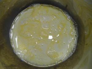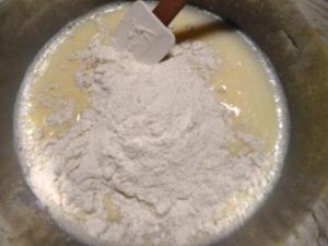 En otro tazón grande mezclar los huevos con el aceite (o mantequilla derretida) y leche. Esto se hace totalmente a mano, no necesitan batidora, simplemente mezclan bien hasta ver que todo se haya integrado.