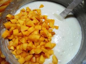 Ahora agregar los duraznos, los cuales deben haber sido pelados y cortados en cuadritos, naturalmente sin la semilla. Cuando corten los duraznos tengan cuidado de descartar las partes que están bien pegadas a la semilla, verán que hay pedacitos de color marrón oscuro que son bien duros, esos no los queremos en nuestros muffins, ¿de acuerdo?