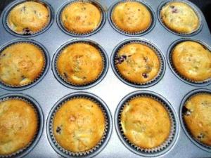 Bueno pues, estos muffins capturan esa combinación de frutas, pero no es invento mío, lo he tomado del libro Muffins de Williams-Sonoma, que si bien no tiene muchas recetas de muffins, las que tiene son todas increíbles. Una vez más tuve que acomodar un poco la receta: me pareció que no tenía suficiente leudante, así que le puse bicarbonato de soda (no lo pide la receta); el dulce me pareció muy poco, así que le puse un poco más de azúcar, pero sólo un poquito más; en lugar de mantequilla derretida le puse aceite de girasol y finalmente, en lugar de licor de bayas (¿dónde se consigue eso?) le puse licor de durazno.