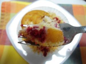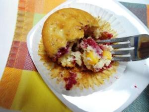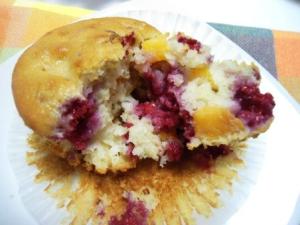 Es un muffin muy suave, no muy dulce, donde se combina perfectamente el sabor del durazno fresco con la frambuesa macerada en un poco de azúcar y licor de durazno. Tienen que probarlo.