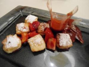 Pedimos unas Bombetas de Saúco, que son como unos buñuelos de vainilla acompañados con salsa de saúco y fresas frescas, viene además con un vaso de caramelo, el cual te lo rempen al servir el plato. El otro postre eran unos Buñuelos de Manzana, servidos con helado de vainilla, naranjas, rodajas de manzana y una salsa de caramelo al pisco que estaba extraordinaria.