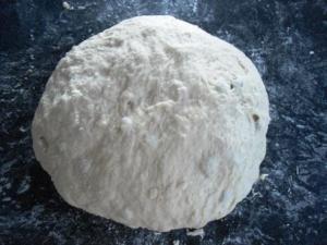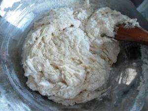Colocar la masa sobre una superficie bien enharinada y amasar un poco para poder darle la forma del pan. No se recomienda amasar mucho (como se haría con cualquier otra masa de pan con levadura) porque entonces se escaparían los gases generados por el bicarbonato.