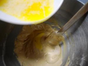«Vierta la mantequilla derretida en forma de hilo y agregue la cobertura de chocolate picada». La mantequilla se puede derretir en el microondas, pero debe estar fría para poder agregarla al batido, así que derritan la mantequilla antes de ponerse a hacer las Magdalenas. Mientras va cayendo la mantequilla van moviendo en forma envolvente. Para que sea más fácil les sugiero que dejen el tazón en la base de la batidora, bien enganchado, así no se moverá mientras hacen la mezcla. Ah…no le puse chocolate, ya no tenía…