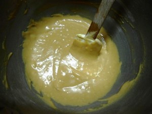 Pues bien para hacer esta Magdalenas de Lúcuma hay que «batir los huevos con el azúcar hasta disolverla completamente». Muy bien, yo batí hasta tener punto cinta, ¿saben cómo es eso? Pues el batido debe estar pálido, espumoso y cuando levantan la masa con la espátula ésta cae formando una cinta. Incluso algunos le llaman punto letra porque al caer la masa puedes hacer algunos trazos, como letras.