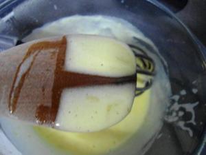 Cuando esta espuma empieza a desaparecer verán que la crema comienza a espesar. Para saber si ya está, prueben con una cuchara de madera, la crema deberá dejar una capa en la cuchara y si se pasa el dedo, quedará dibujado un surco que no se debe juntar. Si usan un termómetro, entonces la crema estará cuando este marque unos 154°F/68°C, la recomendación es que la crema no supere esta temperatura.