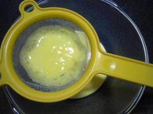 Retirar el tazón del agua caliente y pasar la crema por un colador. Esto hará que la crema quede con mejor textura ya que en el colador se quedarán algunos restos de huevo además de la ralladura de limón.