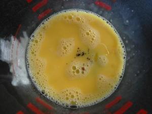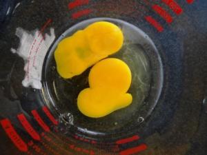 Por otro lado, en un tazón mezclar los huevos. No es necesario batir, sólo deberán hacer que las yemas se mezclen con las claras. Pueden hacer esto en un tazón o en una taza grande de medir, que es donde yo la hice, porque al final van a necesitar un recipiente con pico para que les sea más fácil verter la mezcla dentro de los moldes. Claro que todo esto pueden hacerlo en un tazón y luego pasar todo a una jarra.