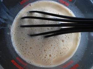 Agregar a los huevos la leche, que debe estar tibia, y con el batidor de mano ir mezclando mientras va cayendo la leche. Por favor, no le vayan a poner la leche caliente porque corren el riesgo de obtener huevos revueltos en lugar de la crema para la Leche Asada. La leche debe estar templada, es decir que al tacto no les debe quemar.
