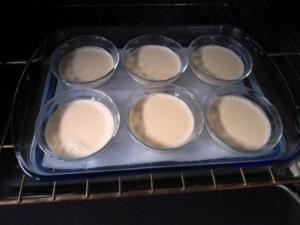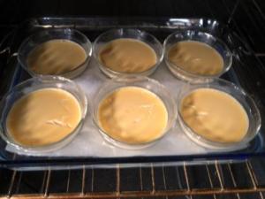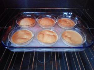 Llevar el recipiente al horno precalentado a 350°F/180°C. Una vez dentro recién deberán poner el agua hirviendo dentro del recipiente, cuidando de que no caiga agua dentro de los moldes individuales. Hagan esto con mucho cuidado para que no se quemen. Luego cerrar la puerta del horno y dejar que se cocinen.