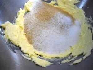 Para hacer la masa, poner a cremar la mantequilla con el azúcar. La receta solo pide azúcar blanca, sin embargo le puse blanca y rubia. Me gusta el sabor que le da el azúcar rubia a las galletas.
