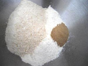 2. En el tazón de la batidora colocar los dos tipos de harina, reservando ¼ de taza de la harina común, agregar la levadura instantánea, mezclar y hacer un hueco en el medio.
