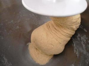 Con una espátula de madera mezclar los secos con los líquidos, luego prender la batidora adaptada con el gancho de amasar y a baja velocidad batir por unos dos minutos. Si es que después de ese tiempo ven que la masa se pega a los bordes del tazón quiere decir que le falta un poco más de harina, por eso es que reservamos el cuarto de taza, así que agreguen por cucharadas un poco más de harina hasta que vean que la masa se desprende totalmente del tazón. Logrado eso, batir por un par de minutos más.