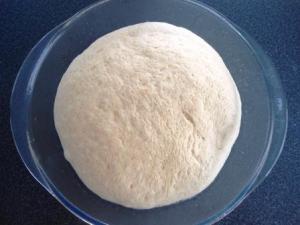 5. Colocar la masa sobre la mesa, amasar por 1 minutos, formar un bollo y colocar en un tazón aceitado, colocar un poco de aceite sobre la masa, cubrir con film y dejar reposar por 1-1 ½ hora o hasta que duplique su volumen.