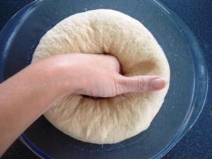 Muy bien, retirar el film y con el puño de la mano desgasificar la masa, es decir, darle un pequeño golpe para que los gases producidos por la levadura se vayan. Sí, luego de haber esperado todo este tiempo para que la masa leve hay que bajarla. No me pregunten por qué, como no he estudiado panadería no tengo una respuesta, solo sé que así es, así se trata a toda masa que leva.