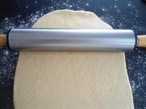 Luego enrollar. Van enrollando y van presionando con la mano para sellar el rollo con la masa que va quedando en la mesa. Seguir así hasta llegar al final de la masa: enrollan, presionan, enrollan, presionan.