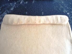 Cuando ya tengan toda la masa enrollada, presionar los extremos y doblar lo que sobra de modo que todas las uniones de la masa queden abajo. Es decir, en la parte de abajo del pan deberá quedar la unión del enrollado y la de los dos extremos.