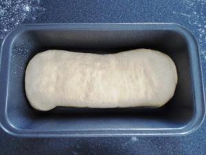 6. Desgasificar la masa, colocarla sobre la mesa enharinada y con un rodillo estirar hasta obtener un rectángulo de unos 9×14 pulgadas / 22×35 centímetros. Enrollar haciendo presión con la mano y colocar en el molde con el cierre de la masa para abajo. Cubrir con film y dejar reposar por 1-1 ½ hora o hasta que duplique su volumen.