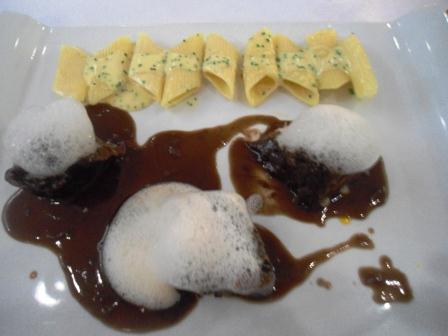 Para los platos de fondo cada uno pidió el suyo, claro que la idea era igual probar de todos, así que debíamos tratar de pedir uno diferente cada uno. Naturalmente la primera opción fue el Cordero de Candarave y Mollejas de Ternera con Gnocchi al aroma de Huacatay y aire de Parmesano, había escuchado maravillas de este plato, sin embargo habían tenido problemas con el proveedor y no tenían el cordero, en su remplazo ofrecían Ternera Lechal, igual lo pedimos. Es un «cordero (o ternera) a la plancha con mollejas laqueadas en glacé de carne. Los gnocchis son salteados para intensificar su sabor, bañados en una salsa de crema y chives, y cubiertos por un aire de parmesano».
