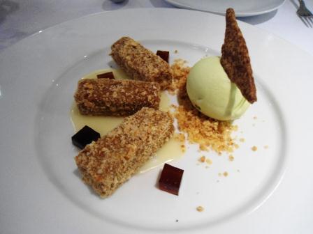 Después de disfrutar cada uno de estos platos, llegó el momento feliz, el momento del postre y al igual que en el caso de la entradas optamos por dos postres para compartir. Uno de los elegidos fue el Cheesecake de Algarrobina: «deditos de cheesecake de algarrobina acompañados de castañas y helado de pistachos». Creo que después de haber disfrutado de tan ricos platos salados estábamos esperando nos sirvieran postres de ensueño, pero no fue así. El helado de pistacho estaba delicioso, me encanta ese helado, pero el cheesecake no lo entendí bien, creo que esperaba un poco más de cremosidad, no lo sé.