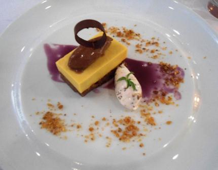 Este plato sí es interesante, Carapulcra Reinventada con Panceta cocida al vacío: «carapulcra tradicional con una esfera de ganach de chocolate que aporta el tradicional toque de chocolate que lleva la carapulcra. Servida junto a una panceta muy suave que está recubierta por canchita chulpi y glacé de cerdo». Confieso que particularmente no soy partidaria de la carapulcra, me gusta el maní, me gusta la papa, pero hay algo en la carapulcra que no he aprendido a comer. Sí, lo probé, sí me pareció que estaba bien elaborada y francamente la esfera de chocolate le da un sabor peculiar. La panceta estaba jugosa y si bien en un principio teníamos un poco de reparo por la grasa, pues ni se sintió.