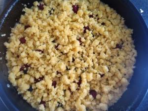Ahora colocar sobre las bayas el crocante. Es mejor hacer esto con la mano, así es más fácil distribuir la mezcla sobre todo el molde.