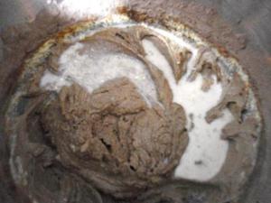 Mientras se va batiendo cernir la harina junto con el polvo de hornear, sal y cocoa (cacao en polvo). Yo lo cierno por tres veces. Bajar la velocidad a la batidora y agregar los ingredientes secos en tres tandas.