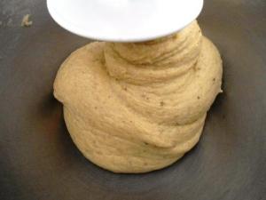 Colocar el tazón en la batidora y batir por unos 5 minutos a baja velocidad con el gancho de amasar. Se debe batir hasta que la masa se despenda de los bordes del tazón.