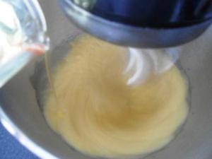 Sin detener la batidora agregar el aceite en forma de hilo, aumentar a alta velocidad y batir por unos dos minutos más, hasta que vean que el aceite se haya integrado, la mezcla esté algo más espesa y además de un color más claro. No esperen obtener una masa pálida puesto que estamos usando azúcar rubia.