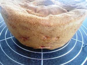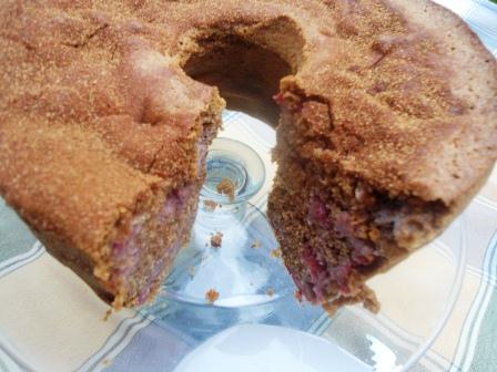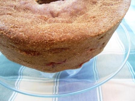 Las fresas se llegan a deshacer bastante, supongo que como el tiempo de horneado es de una hora, eso hace que la fruta termine casi como un puré, como una mermelada, y eso no me gustó mucho, además que al cortar el queque no se ve muy bonito. Creo que para una próxima vez usaré otra fruta, una más resistente, como la manzana, pera o una baya más firme.