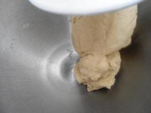 Una vez que ya se haya integrado el agua, pasar el tazón a la batidora adaptada con el gancho de amasar. Batir unos 2 minutos a velocidad muy baja y luego batir por unos 5 minutos a velocidad baja. Si no tienen batidora, entonces deberán colocar la masa sobre la mesa y amasar por unos 8 minutos hasta que la masa esté bien integrada.