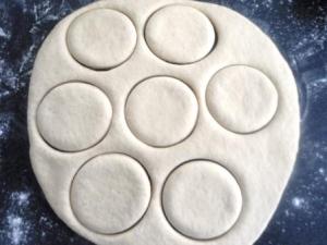Una vez estirada cortar los panecillos con un cortapasta redondo. La masa sobrante la pueden volver a amasar y seguir cortando más.  En total me salieron 14 panecillos. Eso sí, les digo que me resultó un poco difícil volver a amasar el sobrante de masa, como es algo dura hay que ponerle un poco de fuerza.
