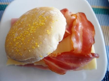 Ya había comido este tipo de sándwich hecho con English Muffin y la verdad es que me parece bastante más sano que cualquier otra opción, naturalmente dependiendo qué se le ponga dentro, además que resulta sabroso sobre todo si lo ponen un momento en la plancha para que esté caliente y el queso se derrita. Otro cuento es cuando te lo sirven con los Huevos Benedictinos, ahí si no me importa la cantidad de calorías.