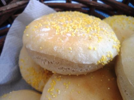 Pasar cada panecillo por polenta o harina de maíz. Presionen con la mano para que esta se adhiera al panecillo por ambos lados. Esto no dice en la receta, pero siempre he visto que los English Muffins tienen un poco de harina de maíz, por eso lo hice.