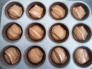 Repartir la masa en los moldes de cupcakes, que deben estar engrasados o con pirotines (cápsulas) para horno.