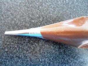 Mientras los cupcakes se hornean preparar la manga con la Nutella para poder rellenar los cupcakes en caliente. Yo uso la boquilla 230 de Wilton para rellenar, pero pueden usar cualquier otra que les facilite la tarea o simplemente sin boquilla y hacen ustedes el hueco en el cupcake para luego rellenarlos.