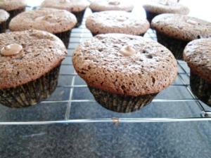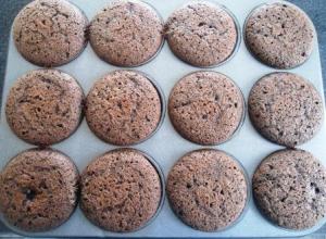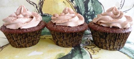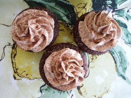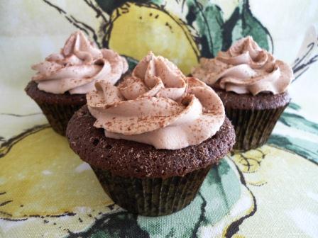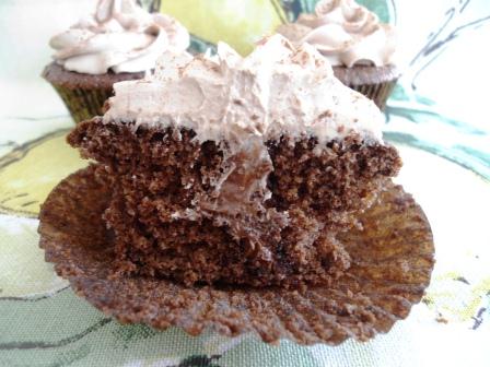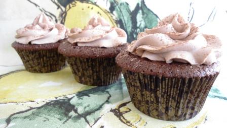 Busqué en mi libro de Cupcakes de Martha Stewart una receta que sea más equilibrada con el uso del chocolate, entonces encontré una receta para hacer unos cupcakes de chocolate de tamaño jumbo. Me pareció una muy buena receta para esta ocasión, pero hice algunos cambios, primero, hice la mitad de la receta para que sólo me salieran 12 cupcakes, segundo, no usé sour cream sino buttermilk de leche descremada, y tercero, le puse una cucharada de Amaretto.