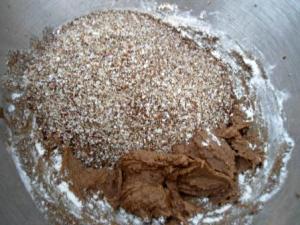 Agregar las hojuelas de quinua y mezclar. A diferencia de las hojuelas de avena, las de quinua son más pequeñitas, por lo tanto no quedan tan a la vista como el caso de la avena luego de mezclar.