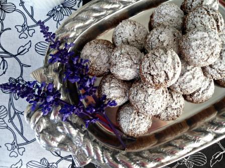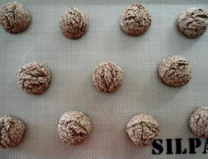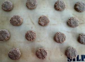 Con ayuda de una cuchara o una cuchara de helado pequeña formar bolitas con la masa y colocarlas en una placa para horno engrasada o con silpat. Esta masa no necesita refrigerar, tiene una textura un poco áspera y es bastante fácil de manipular.